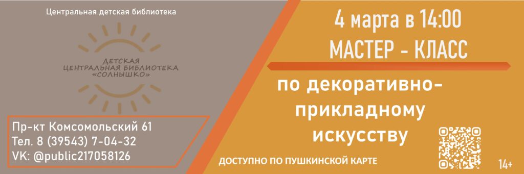Центральная детская библиотека приглашает всех желающих на мастер‑класс по декоративно‑прикладному искусству. Участники узнают основы прикладного искусства, разовьют творческие навыки и получат практический опыт создания оригинального декоративного изделия.