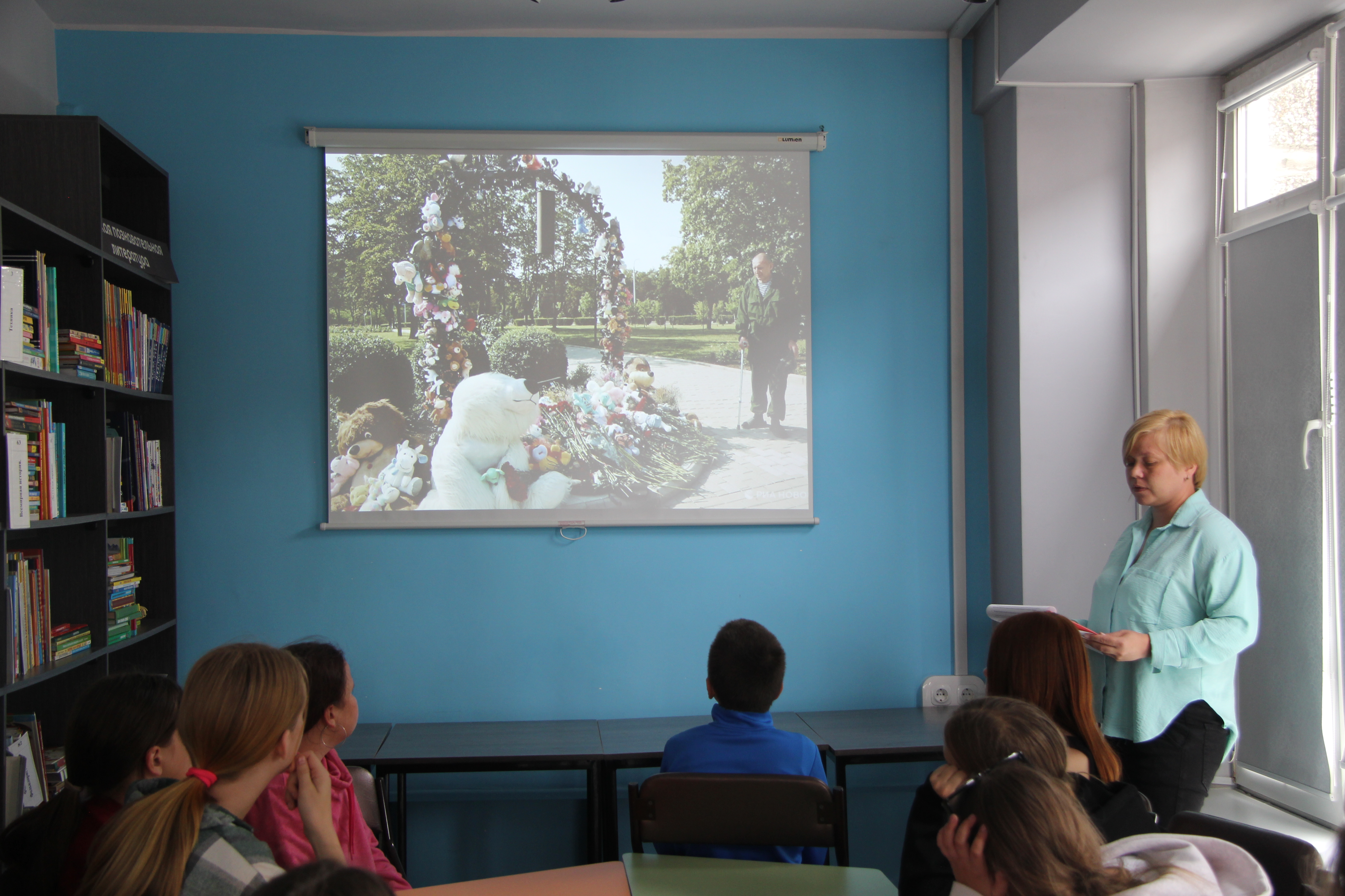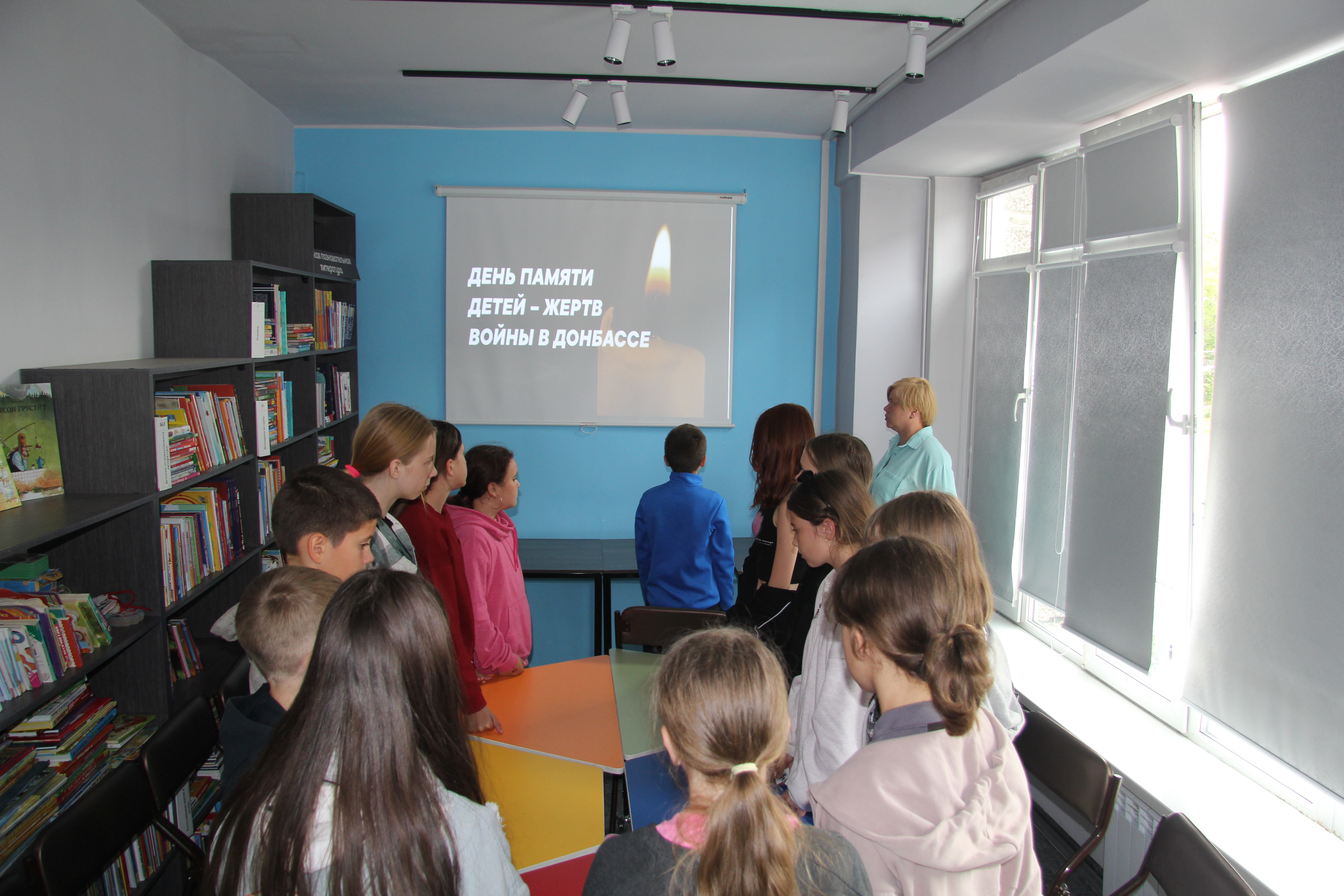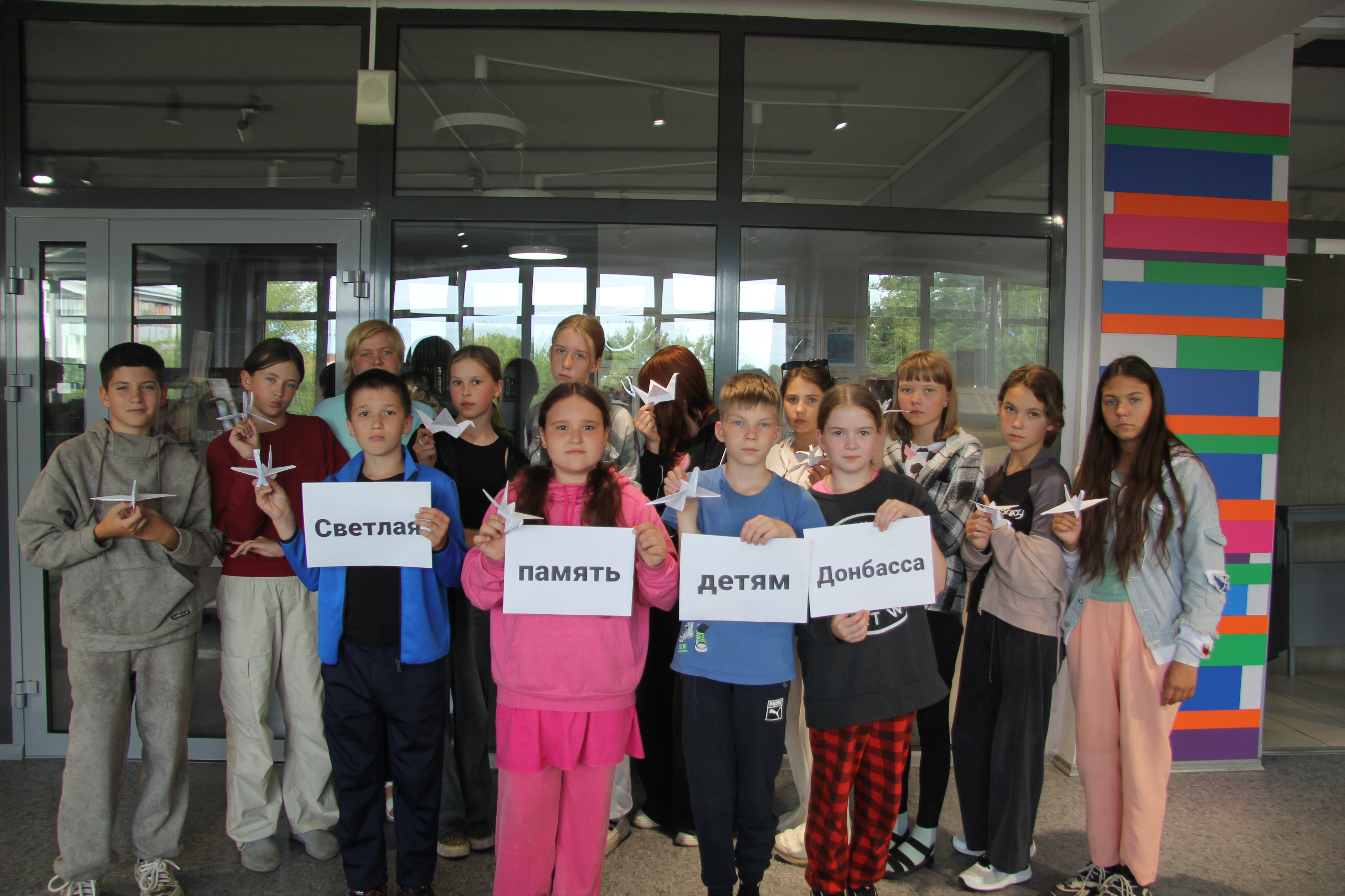 Рассказ был дополнен видеосюжетом о «Детях Донбасса», после которого ребята почтили память минутой молчания. На протяжении мероприятия дети слушали рассказ, шёпотом обсуждая те или иные события, в глазах ребят было сочувствие и понимание всего происходящего. По окончанию ребята узнали о легенде «Белые журавли», после чего совместно с библиотекарем принялись делать журавлей из бумаги в память о детях, погибших на Донбассе.
