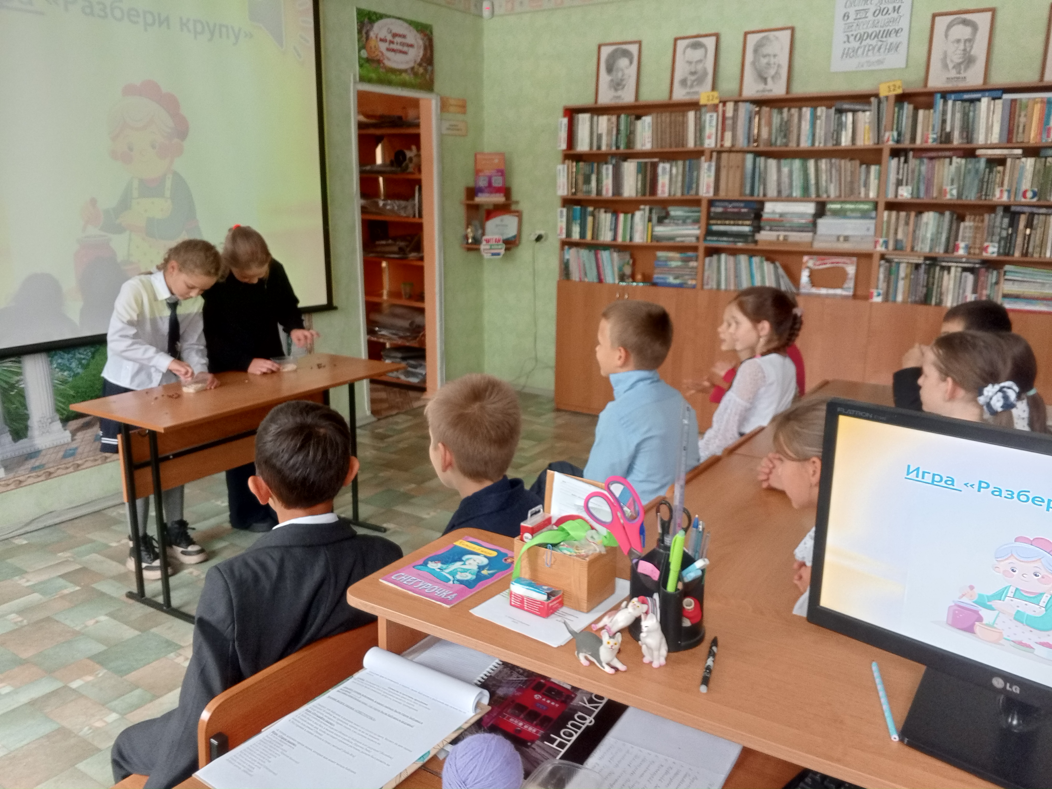 Вспомнили, чем занимаются в свободное время бабушки и дедушки школьников. Выяснили, что наиболее интересное увлечение у дедушек — рыбалка. Поиграли в игру «Ловись, рыбка!». А бабушкам больше нравится готовить разную выпечку и вкусные блюда. С интересом соревновались в игре «Разбери крупу».