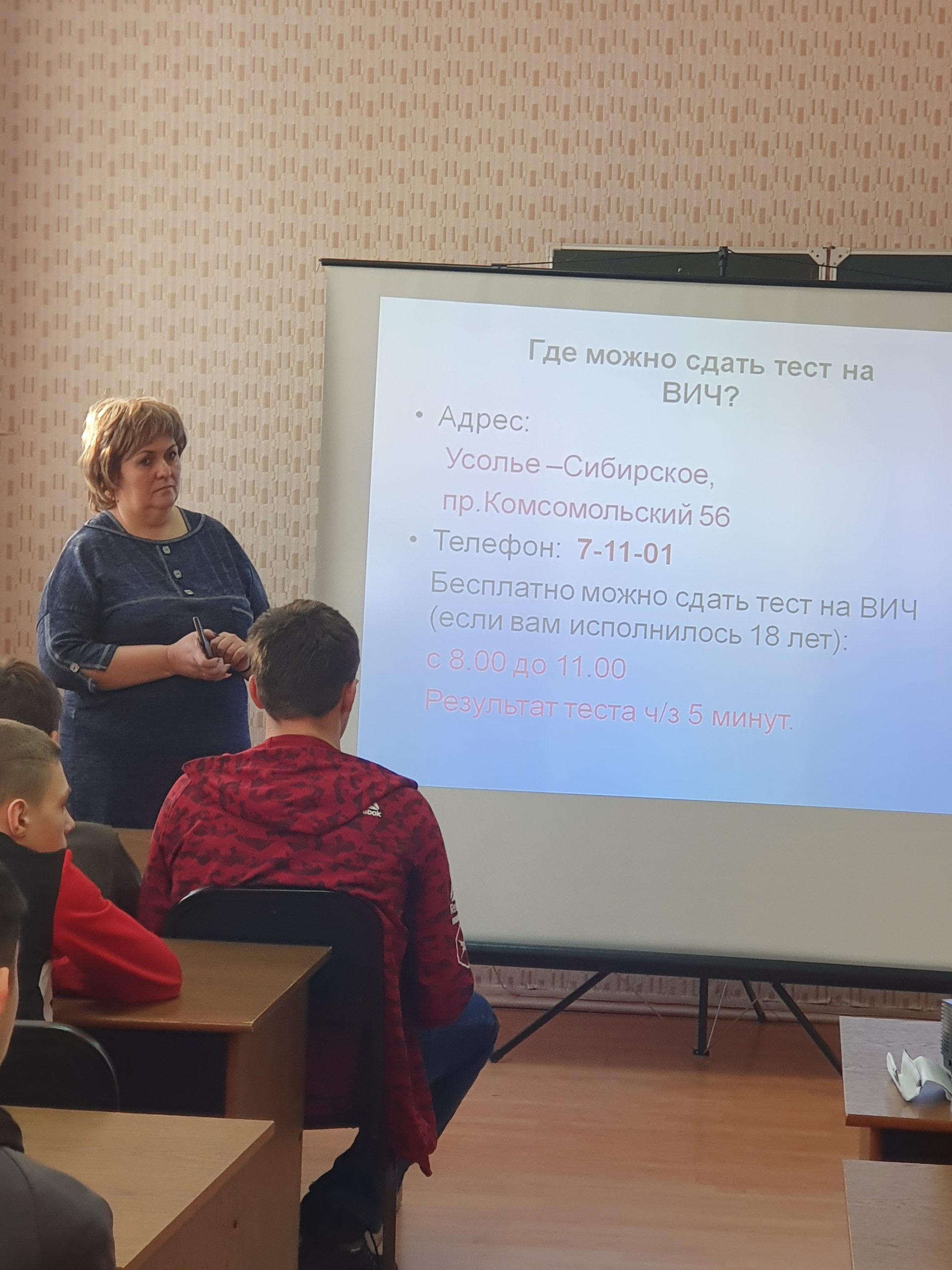 Ребятам рассказали об инфекционной природе этой болезни, о том, что означает ВИЧ и СПИД, какова симптоматика этой болезни, о путях заражения этой страшной инфекцией, а также о мерах предосторожности и профилактики. Светлана Никандровна заострила внимание присутствующих на статистике заболеваемости ВИЧ/СПИД в России и Иркутской области. Так, по данным Федерального регистра пациентов, усольская территория в сибирском антирейтинге заболеваемости, вызываемой вирусом иммунодефицита занимает второе место. Иркутская область в нём занимает третье место (девятое по стране).