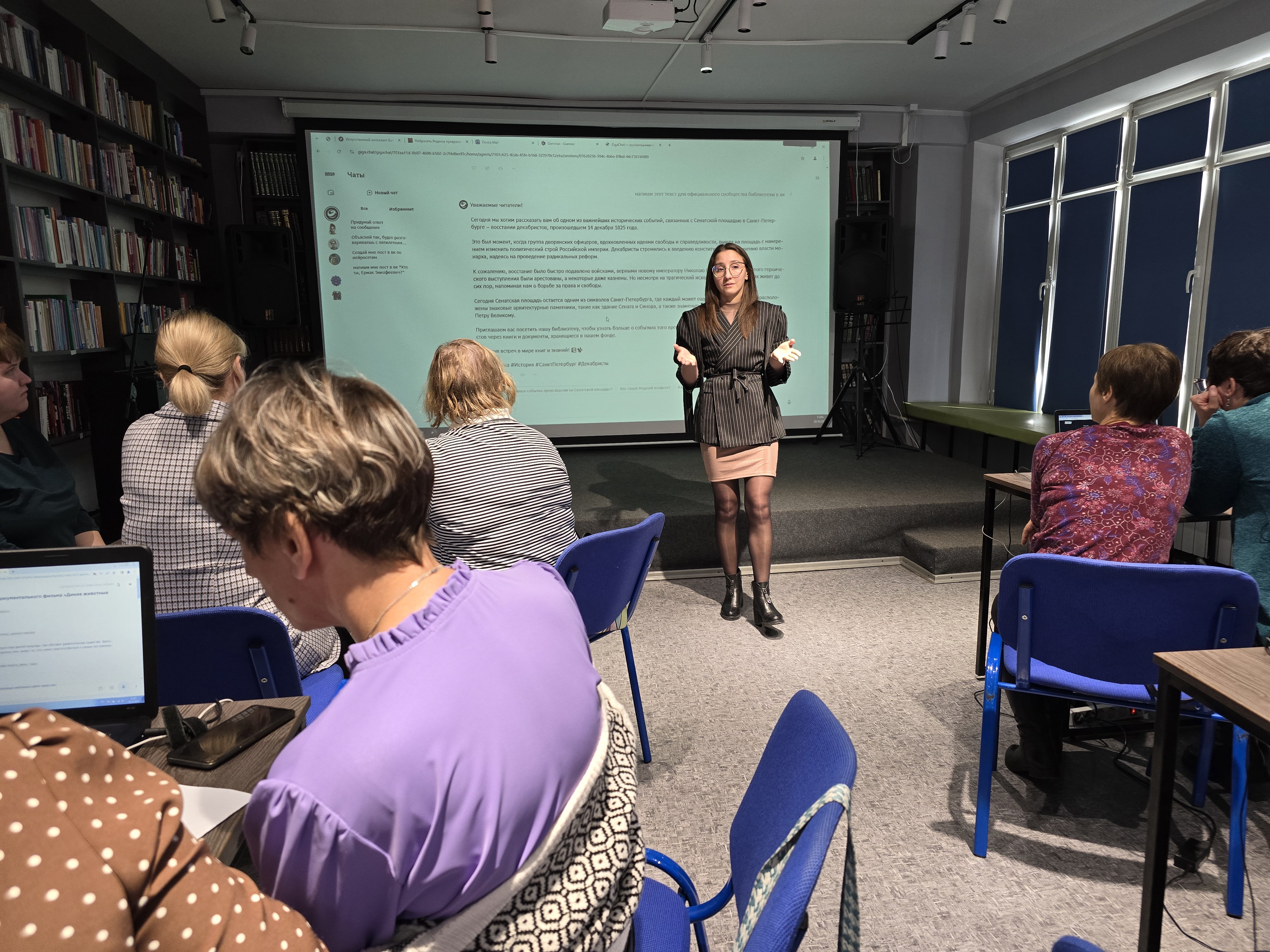 Нейросети, являющиеся важной составляющей искусственного интеллекта, привлекли особое внимание участников встречи. Сотрудники библиотек должны разбираться в современных цифровых технологиях и понимать основы работы нейросетей, чтобы соответствовать актуальным требованиям и предоставлять качественные услуги пользователям. Во время мероприятия библиотекари практиковались в работе с различными нейросетевыми инструментами, такими как ChatGPT, Бот Профи, GigaChat, «Шедеврум» и Gamma. При выполнении практических задач участники поняли, что у искусственного интеллекта есть как плюсы, так и минусы. Необходимо найти баланс между применением технологий и эффективным использованием рабочего времени для достижения целей.