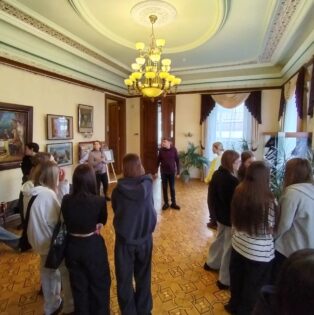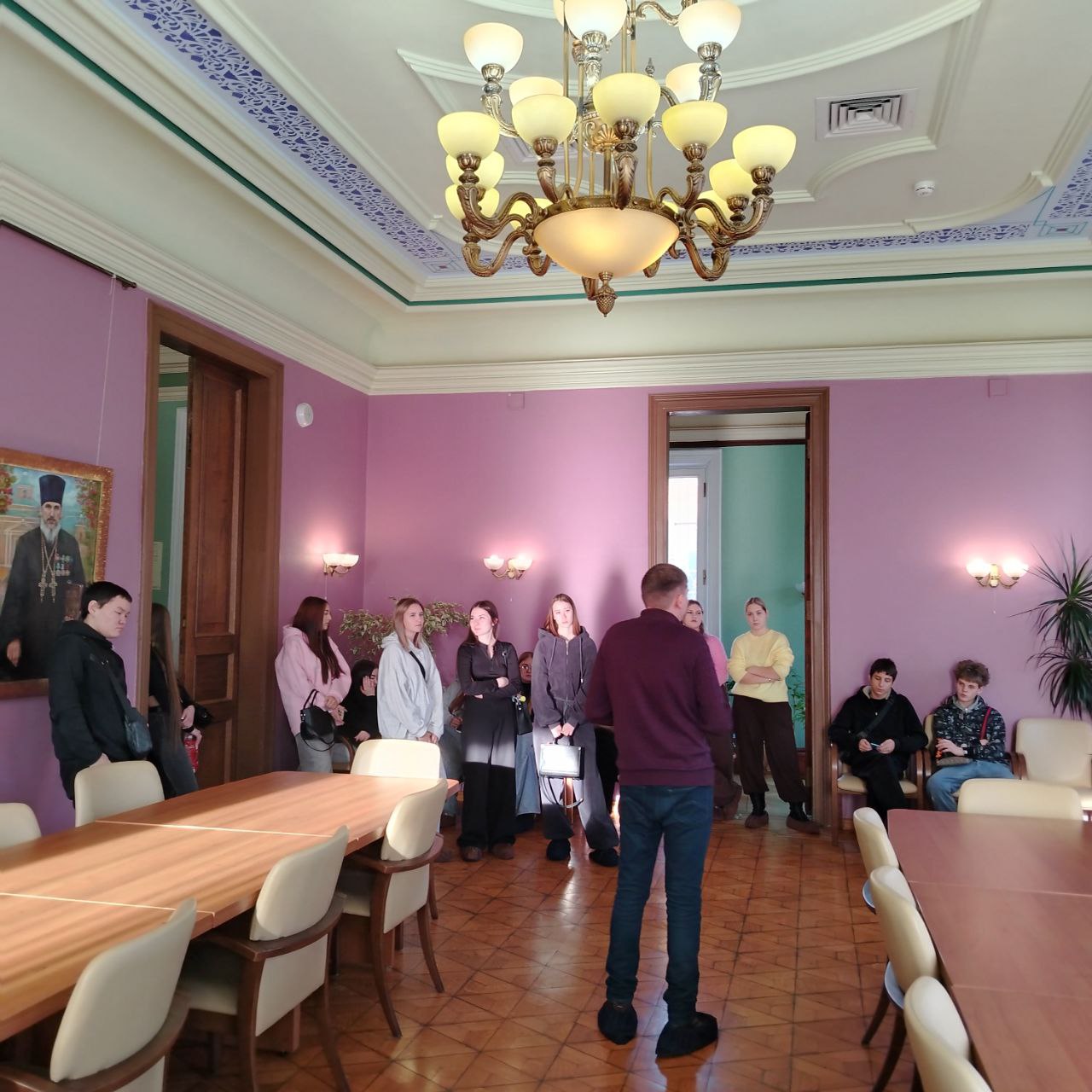 Во время экскурсии студенты познакомились с историей семьи купцов Бревновых, узнали об архитектурных особенностях особняка, его необыкновенной судьбе, а также его значении для Иркутска.