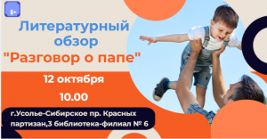 Библиотека-филиал № 6 приглашает всех желающих на литературный обзор «Разговор о папе». Вас ждет интерактивная викторина «Литературные папы», конкурсы, ребусы, песни и стихи о папе.
