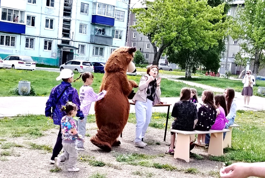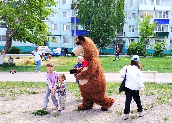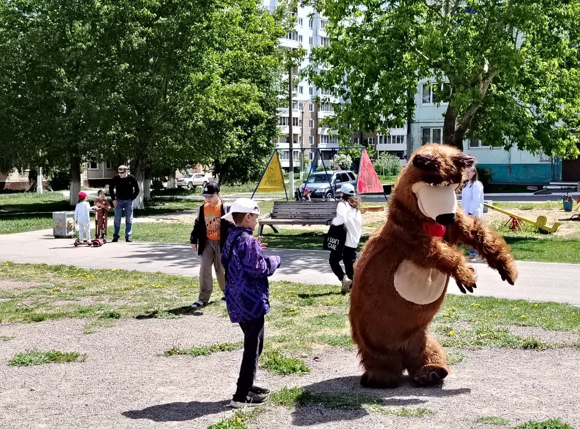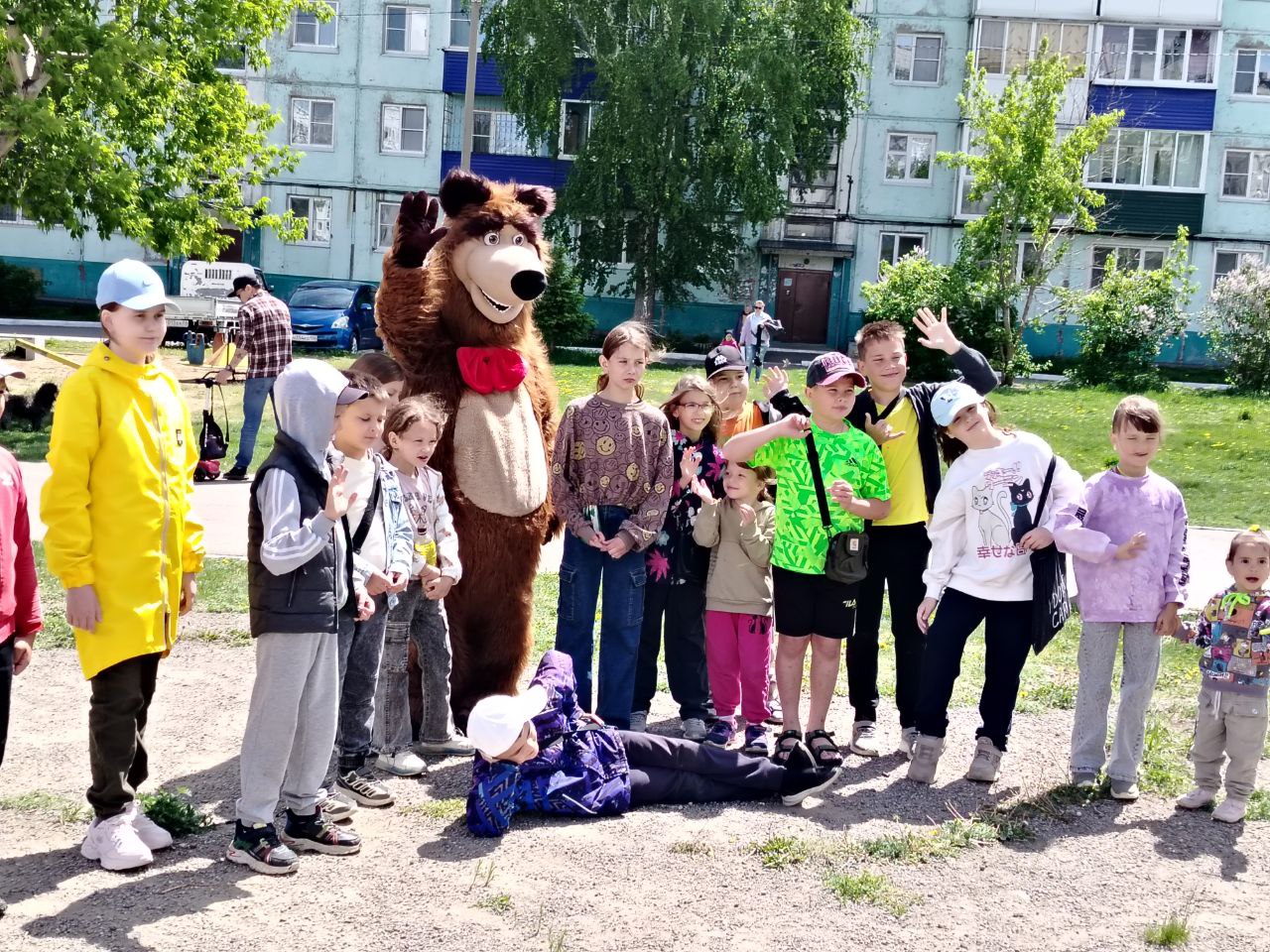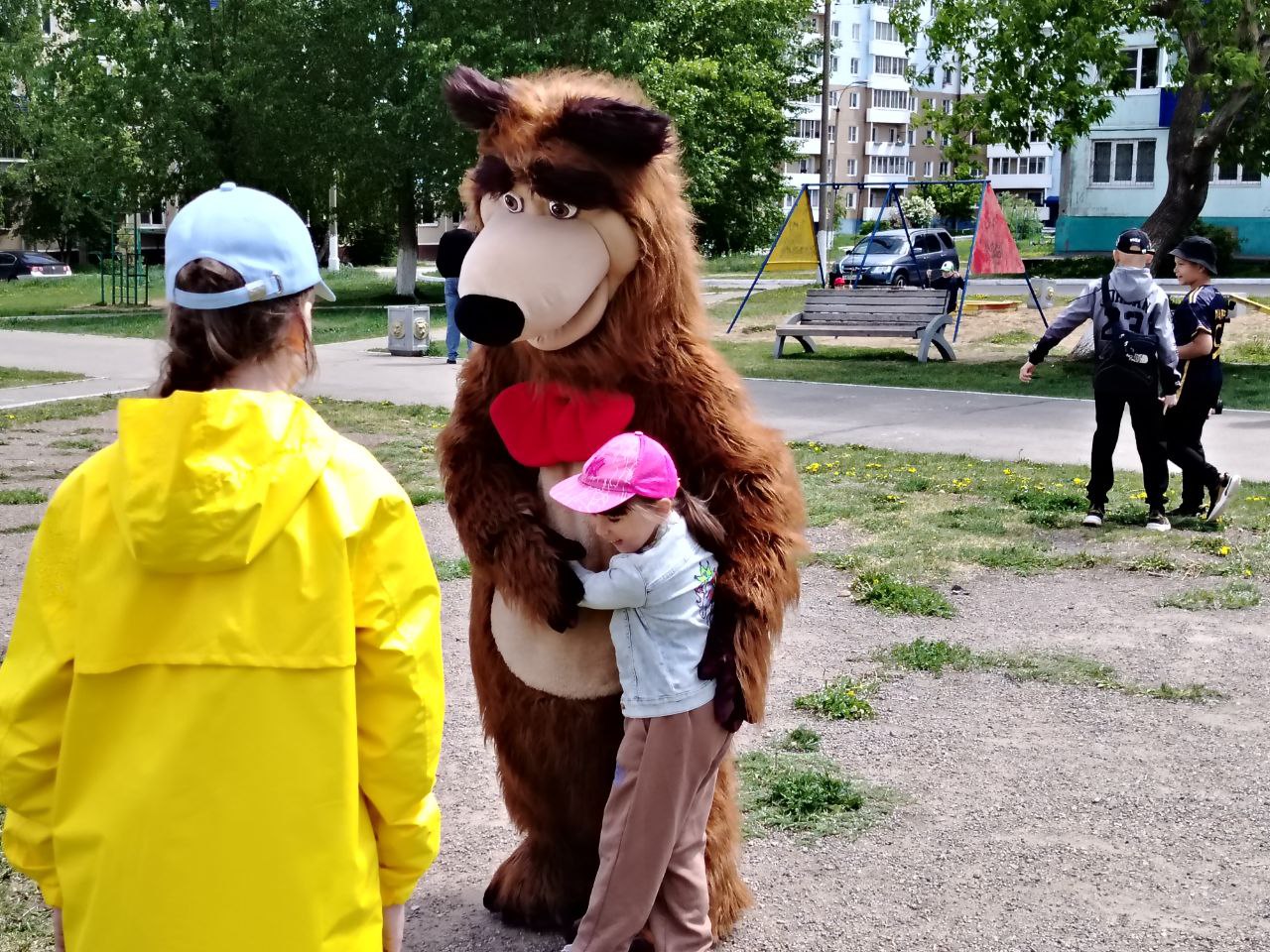 Главным сюрпризом стал гость Мишка из мультфильма «Маша и Медведь». Мишка пригласил всех на веселый танцпол, играл в «Догони меня» и «Обнимашки». Затем все дружно фотографировались и получили сладкие угощения.