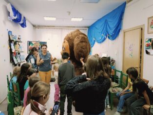 На праздник к детям пришел сам Чебурашка. Чтобы поздравить именинника дети закружились в хороводе, исполняя песенку про каравай. Ещё одним маленьким подарком были портреты Чебурашки, нарисованные с закрытыми глазами.