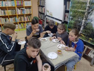 Одна из станций квеста — «Солдатский обед «На привале»» — позволила ребятам отведать солдатский обед: черный хлеб, сало, гречневую кашу с тушенкой, чай и сухари. В завершение мероприятия из собранных букв сложили слово «ПОБЕДА».