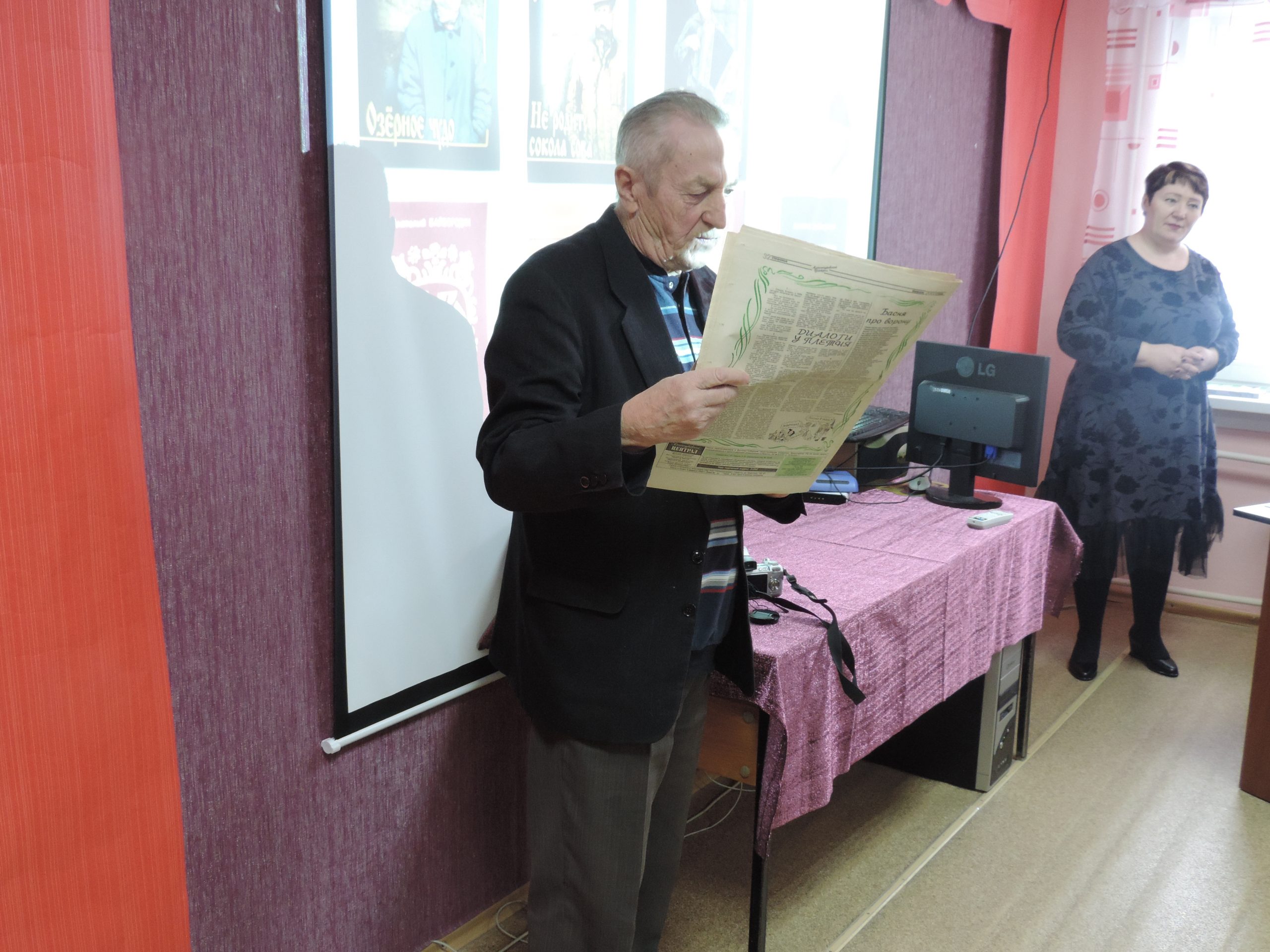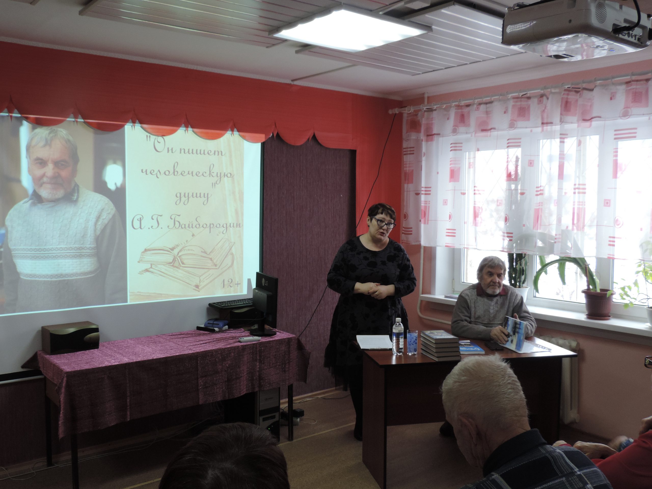 Интересен был рассказ В. Скорохода о том, как очерки А. Байбородина печатались в известном альманахе «Александровский централ». Свои стихи прочитала И. Коноплева и вернула всех немного в детство. Всех заинтересовала книжная выставка «Он пишет человеческую душу», на которой были представлены произведения Байбородина из фондов библиотеки: «Озерное чудо», «Не родит сокола сова», «Диво», «Утоли мои печали», «Небесная тропа» и многие другие. Известный гармонист Александр Чередов исполнил песню «Председатель».