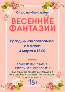 Дорогие друзья!!!! Приближается прекрасный весенний раздник-8 марта. Библиотека-филиал № 6 приглашает дорогих женщин на праздничную программу «Весенние фантазии».