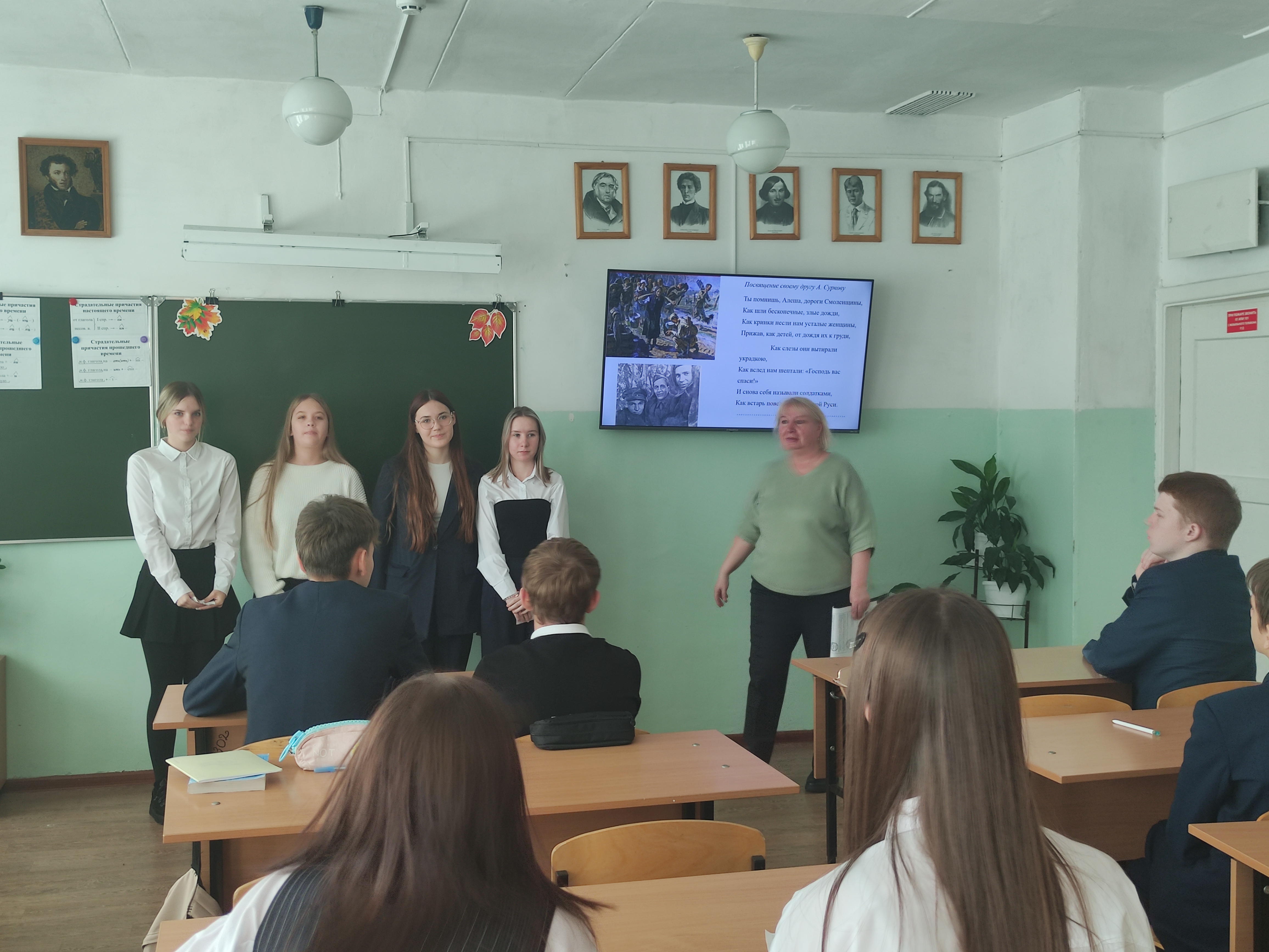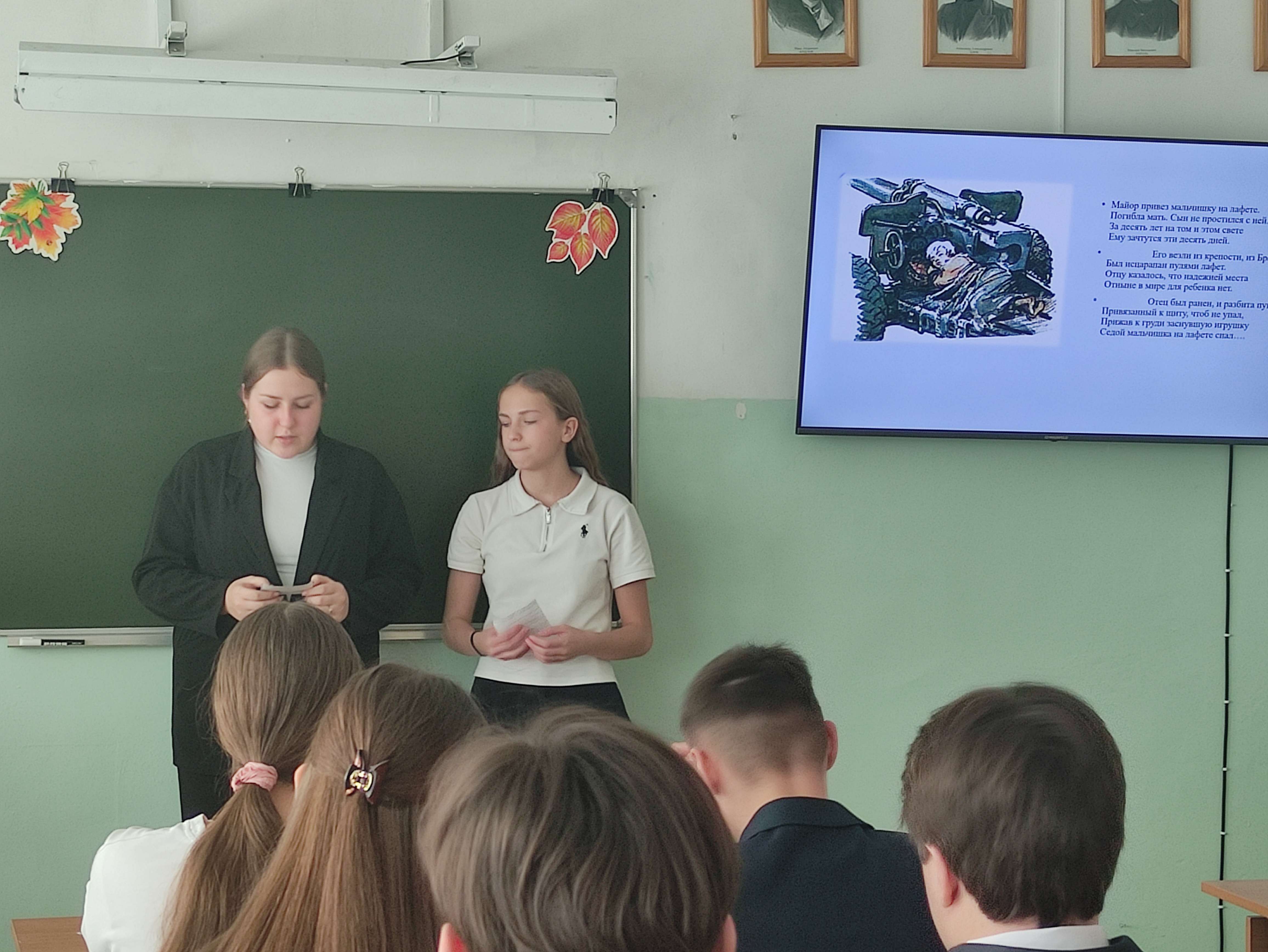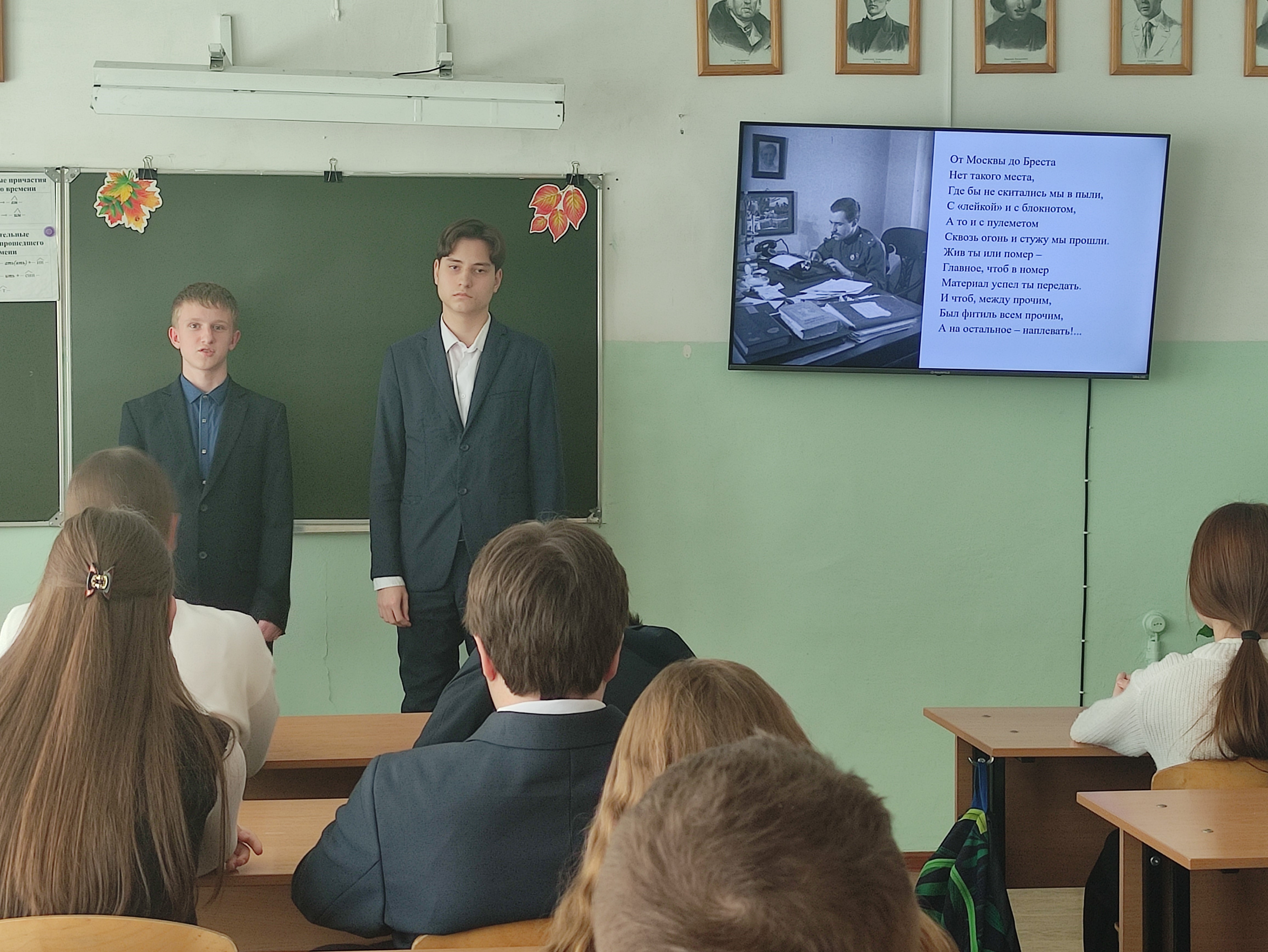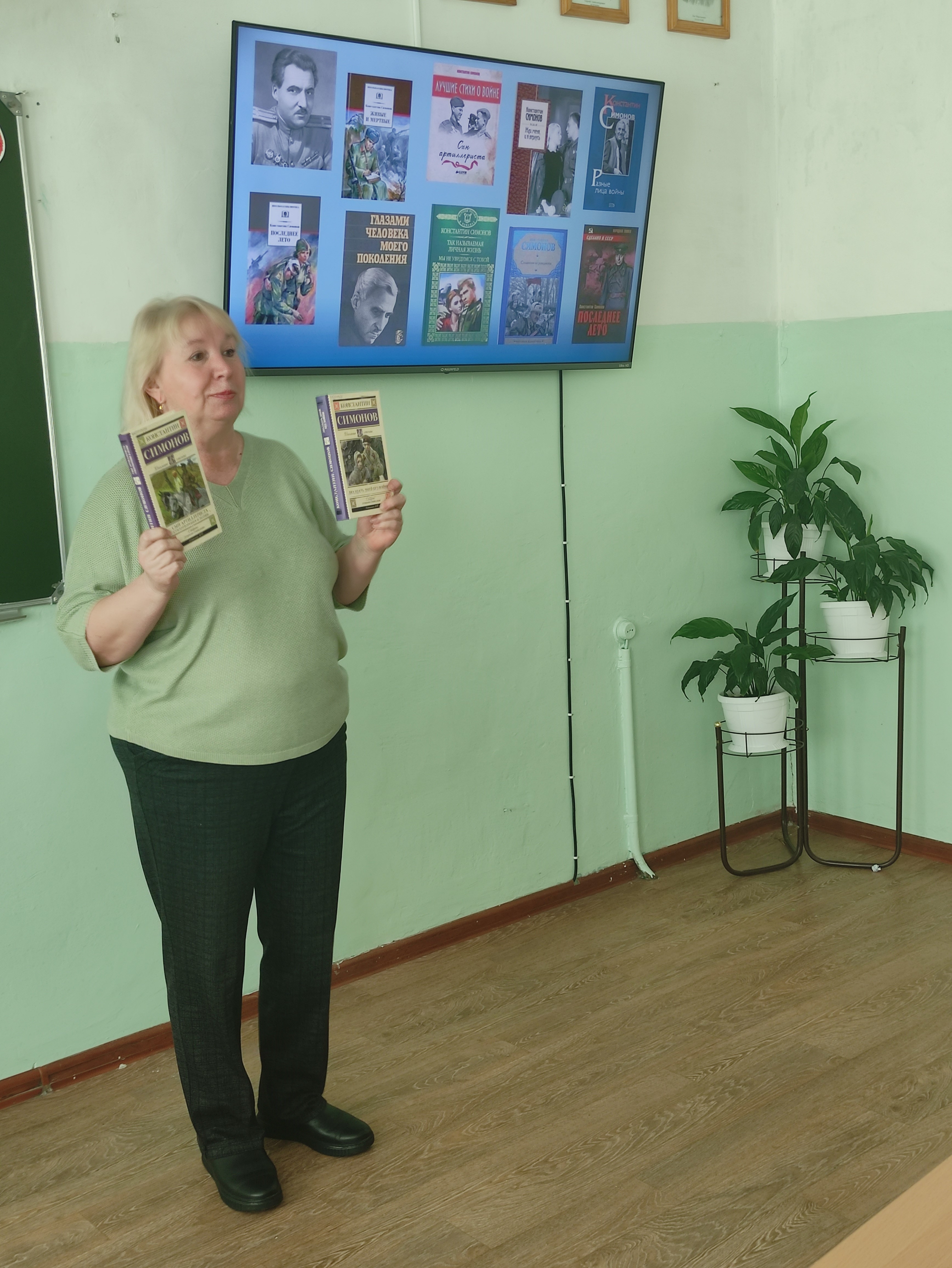 Будучи военным корреспондентом, Константин Симонов правдиво выразил в своих стихах и романах всю правду о войне, отразил мужество и стойкость советских солдат. Его стихи, проникнутые глубоким патриотизмом, стали классикой советской литературы. Ребята читали знаменитые стихотворения: «Ты помнишь, Алёша, дороги Смоленщины…», «Майор привез мальчишку на лафете», «Если дорог тебе твой дом». Ведущая рассказала, как простые и искренние слова стихотворения «Жди меня» стали для миллионов людей молитвой и символом надежды, помогая верить и ждать с фронта близких.