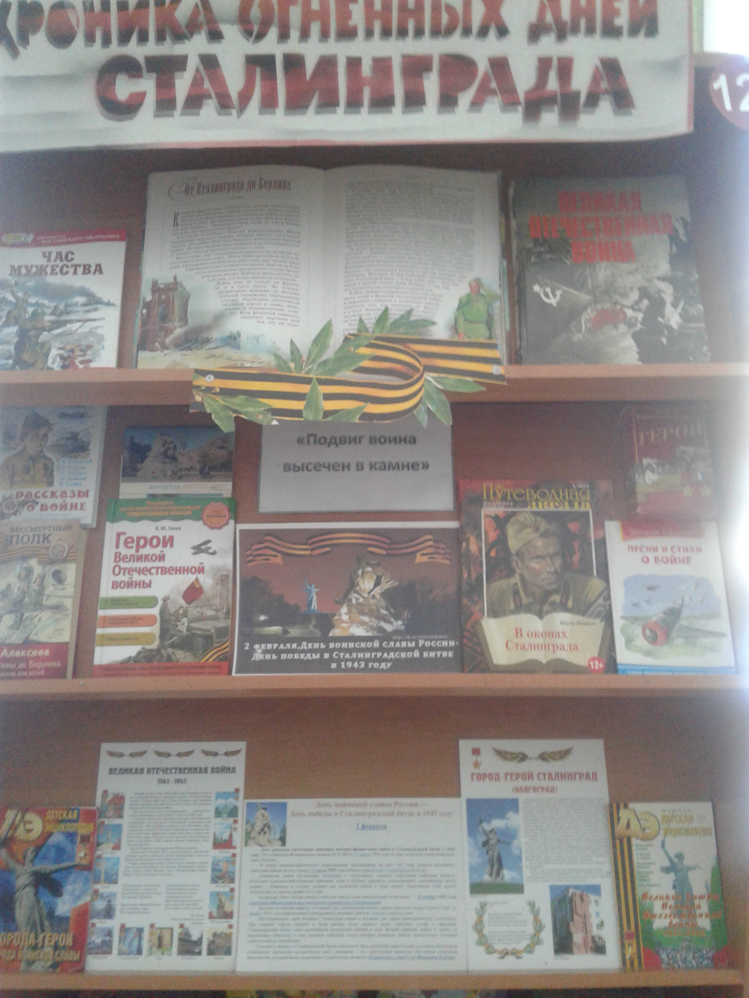 Вниманию ребят была представлена книжная выставка-панорама «Подвиг воина высечен в камне». Книги, представленные на выставке, рассказывают о беззаветном героизме, о подвигах, совершенных нашими людьми во имя Родины и ради защиты всего того, что нам дорого и свято.