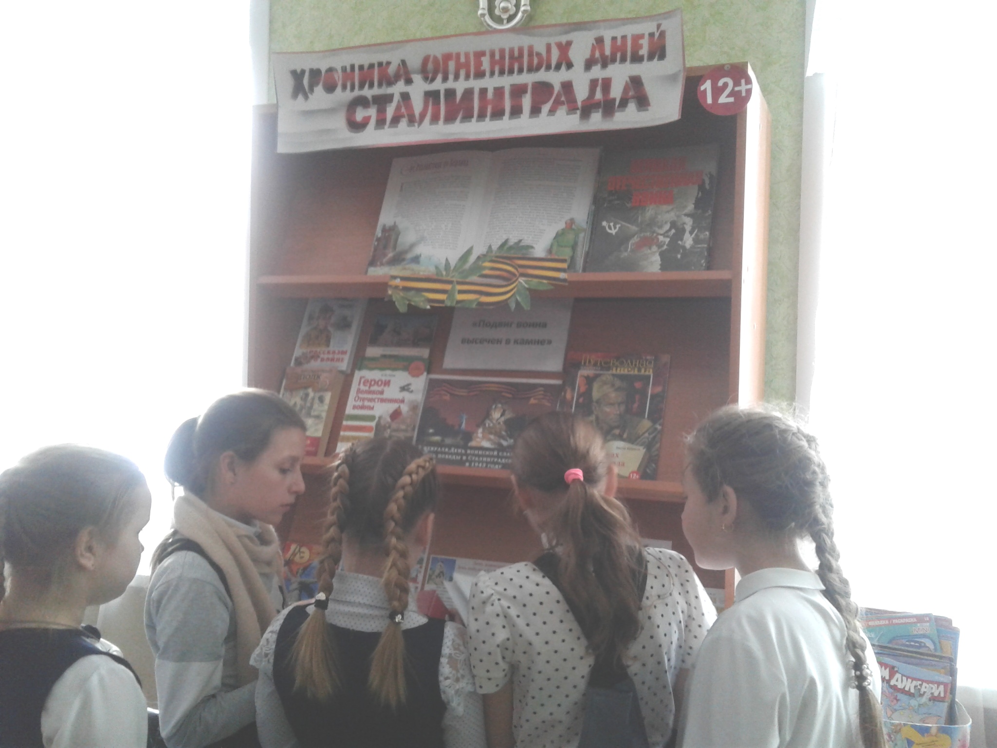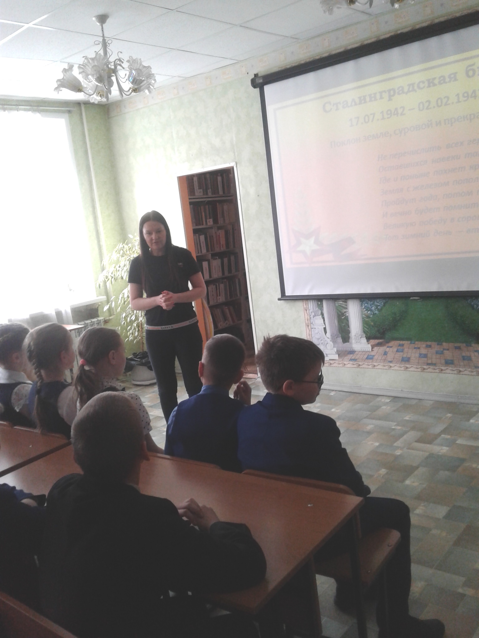 Библиотекарь Светлана Николаевна Андреева рассказала ребятам о подвиге советских солдат, самоотверженно защищавших разрушенный город: это «человек-факел» – Михаил Паникаха, супер-снайпер Василий Зайцев, связист М. М. Путилов. На большом экране дети увидели редкие кадры военной кинохроники. Затаив дыхание, ребята слушали отрывки из рассказа В. Шмерлинга «Дети Ивана Соколова. Отличным дополнением урока стала виртуальная экскурсия по мемориальному комплексу «Мамаев Курган».