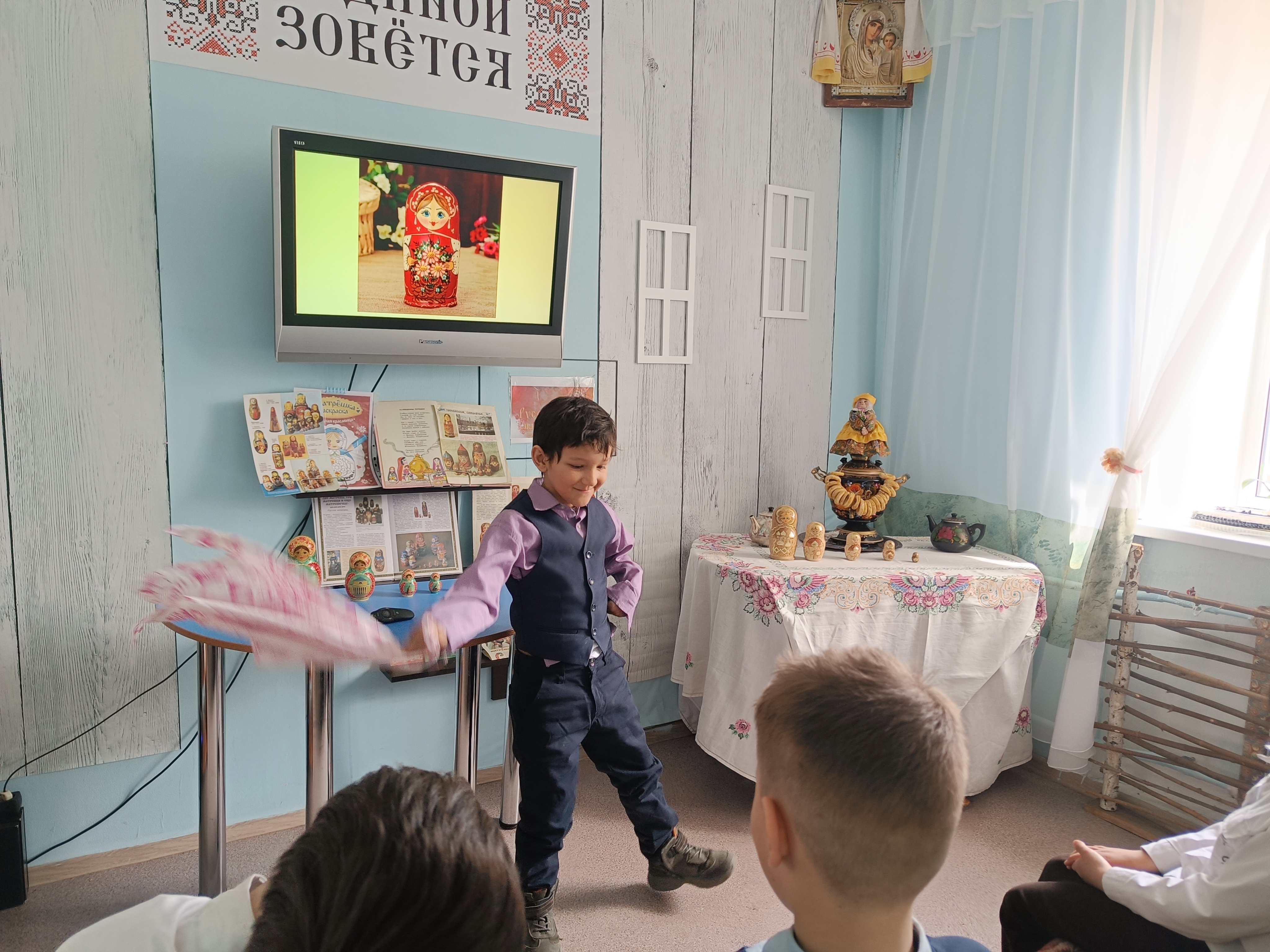 А чтобы закрепить полученные знания и просто весело провести время, ребята окунулись в атмосферу русского народного творчества. Сначала поиграли в задорную танцевальную игру «Косынка», а потом устроили настоящий матрешечный спринт: кто быстрее соберет свою «матрешку».