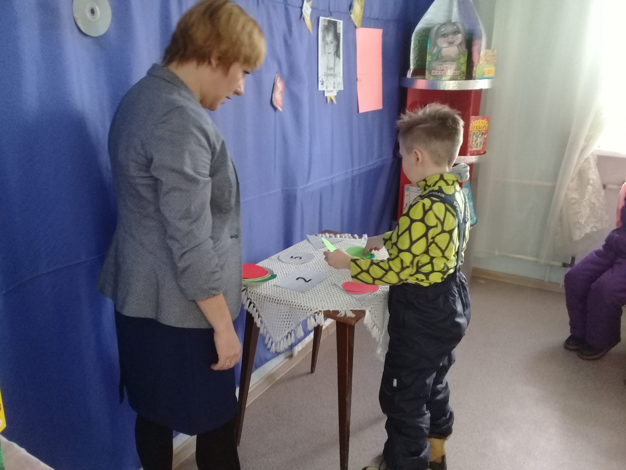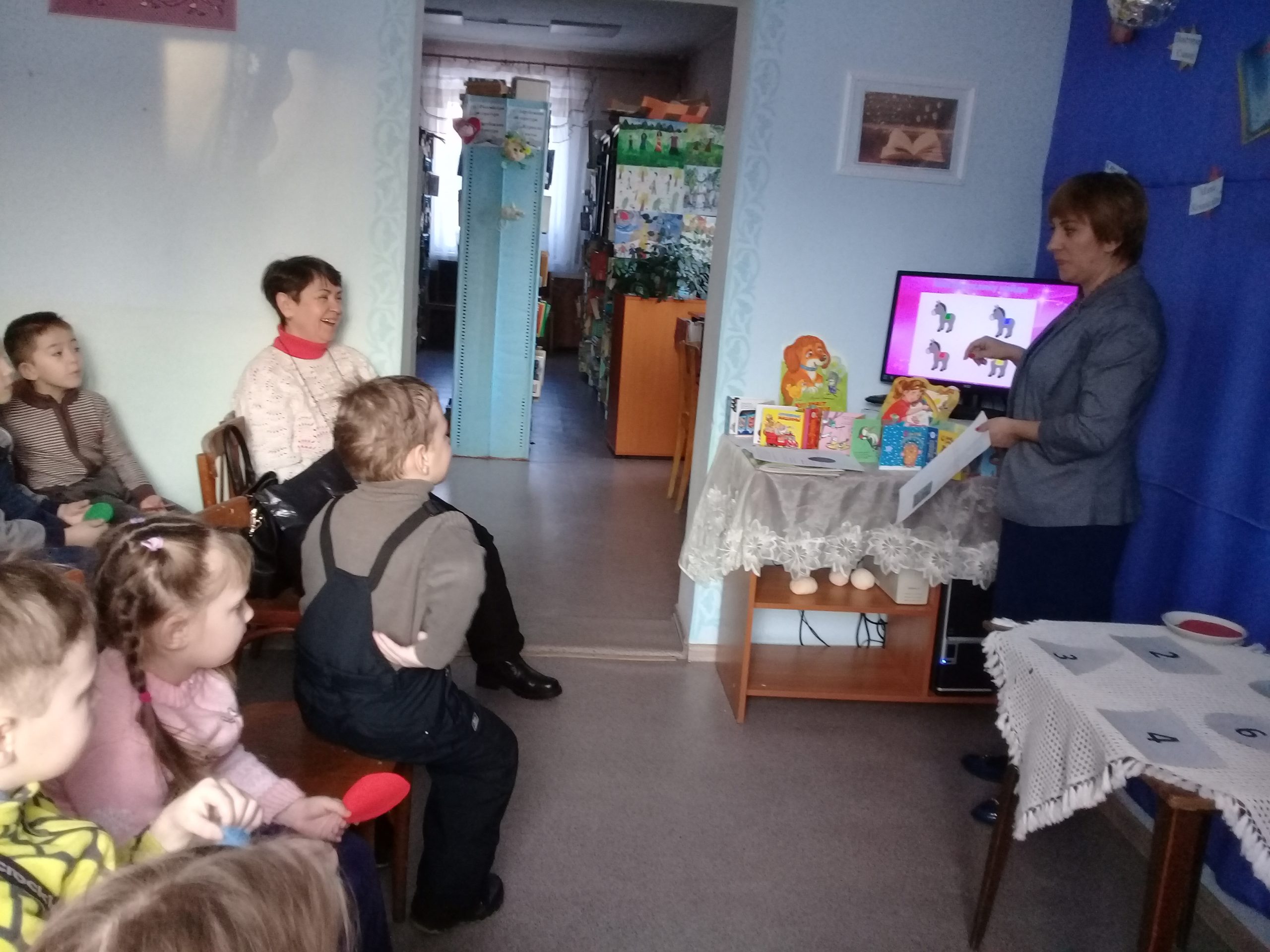 Дети читали стихи о животных, и все хором помогали закончить фразы; отгадывали ребусы и шарады. Дошкольники помогали ослику найти его хвостик, при этом закрепляя цвета и форму геометрических фигур. Не забыли и про счет: предлагалось найти определенное количество кружочков и положить на цифру.