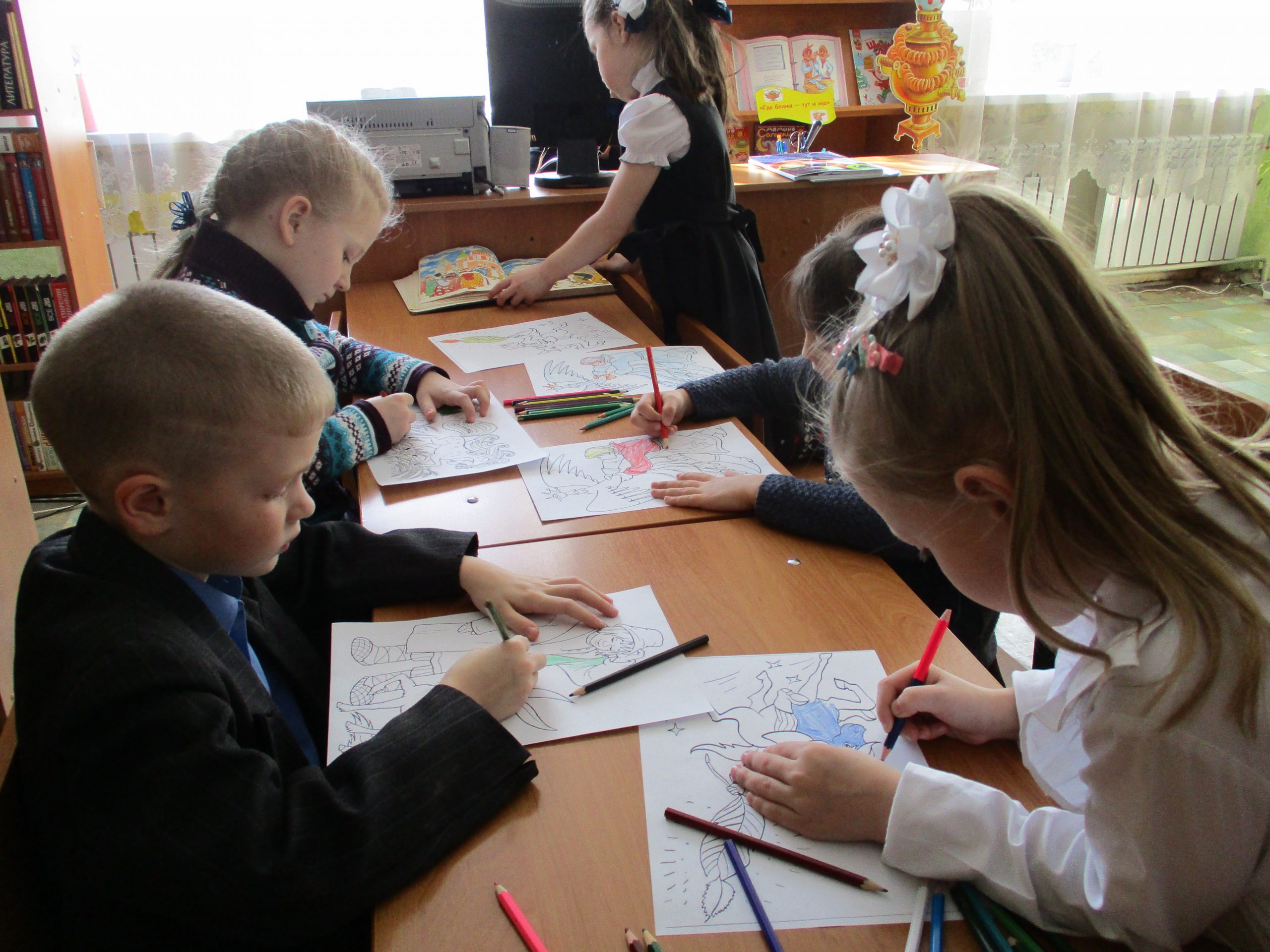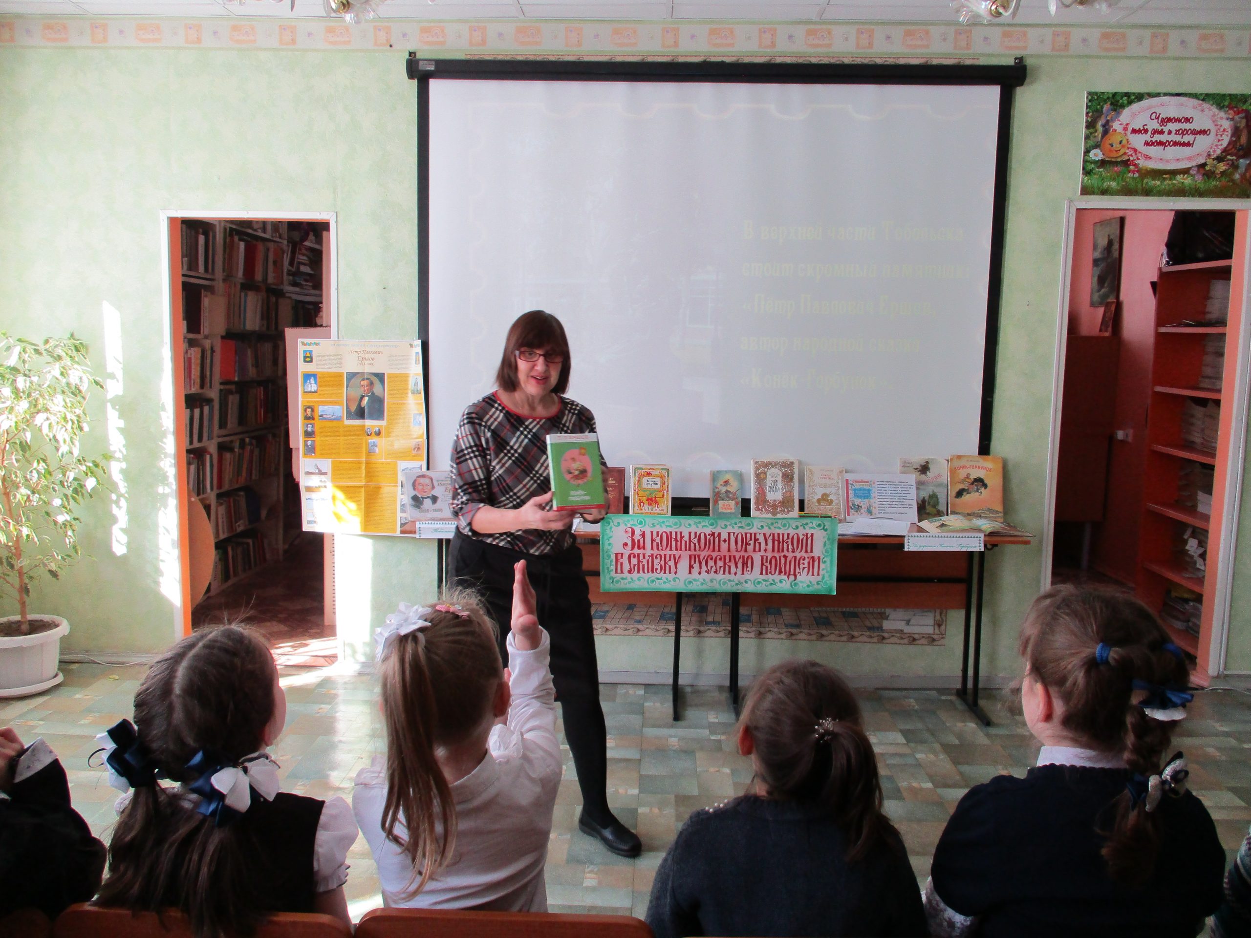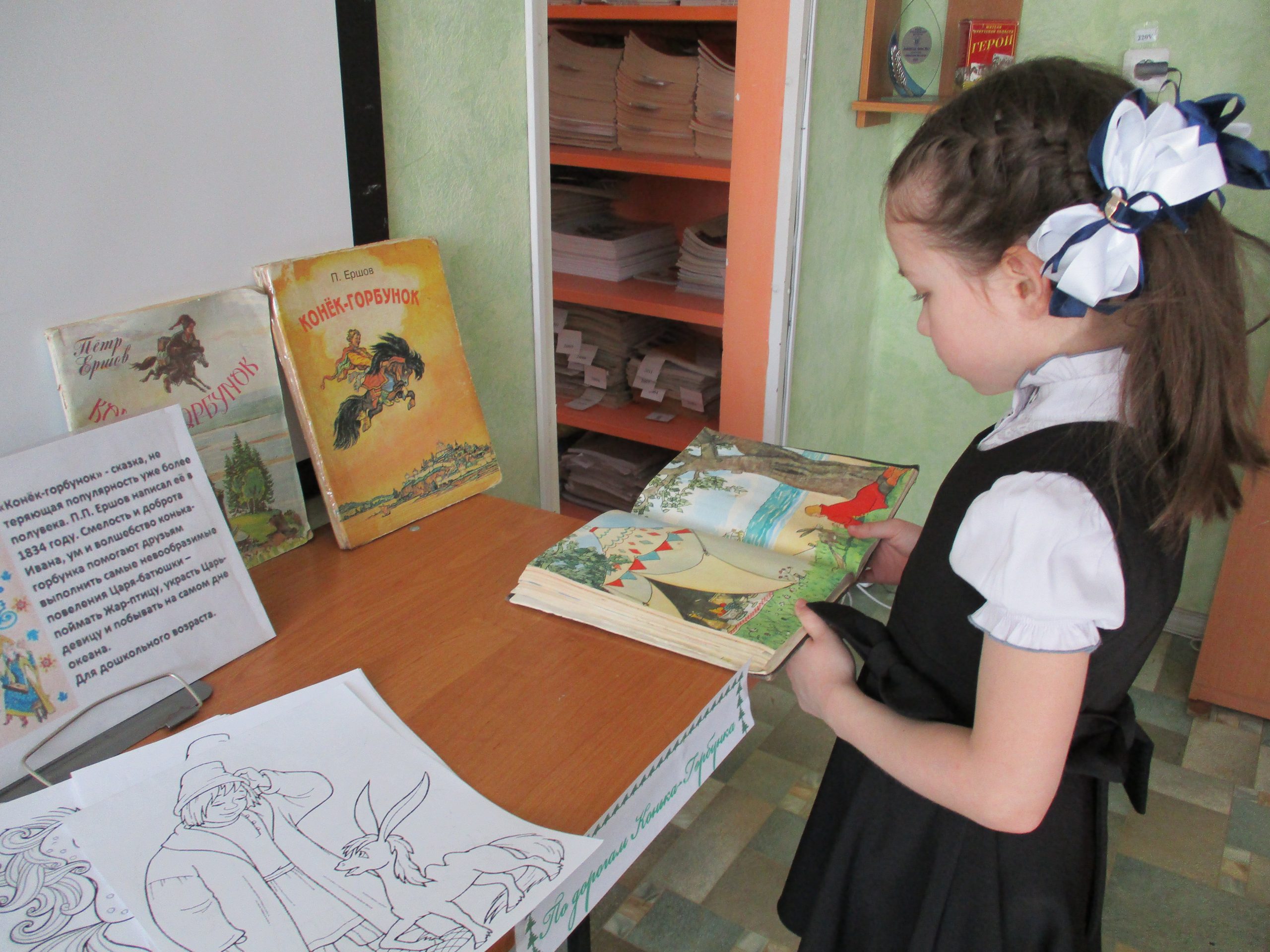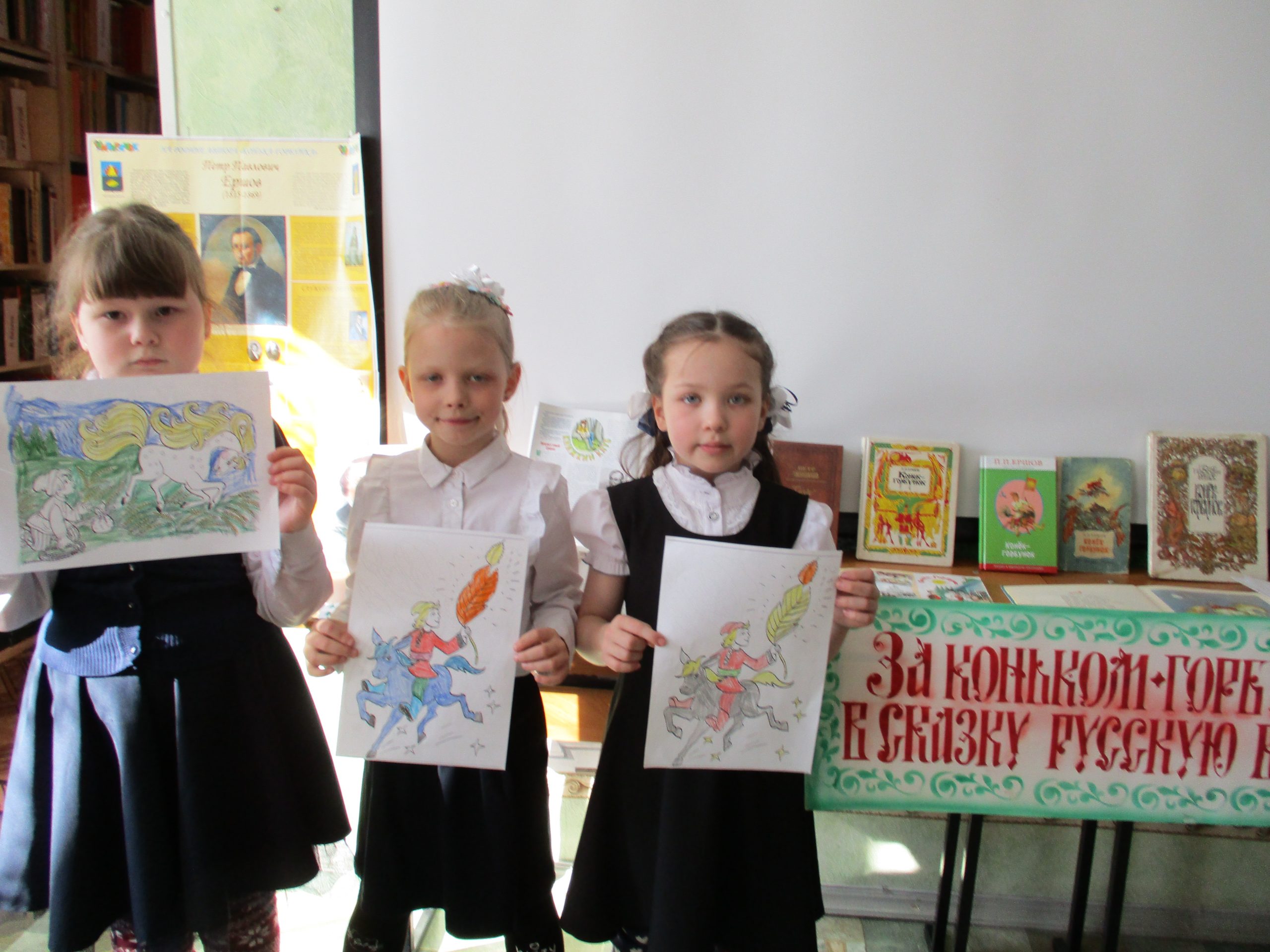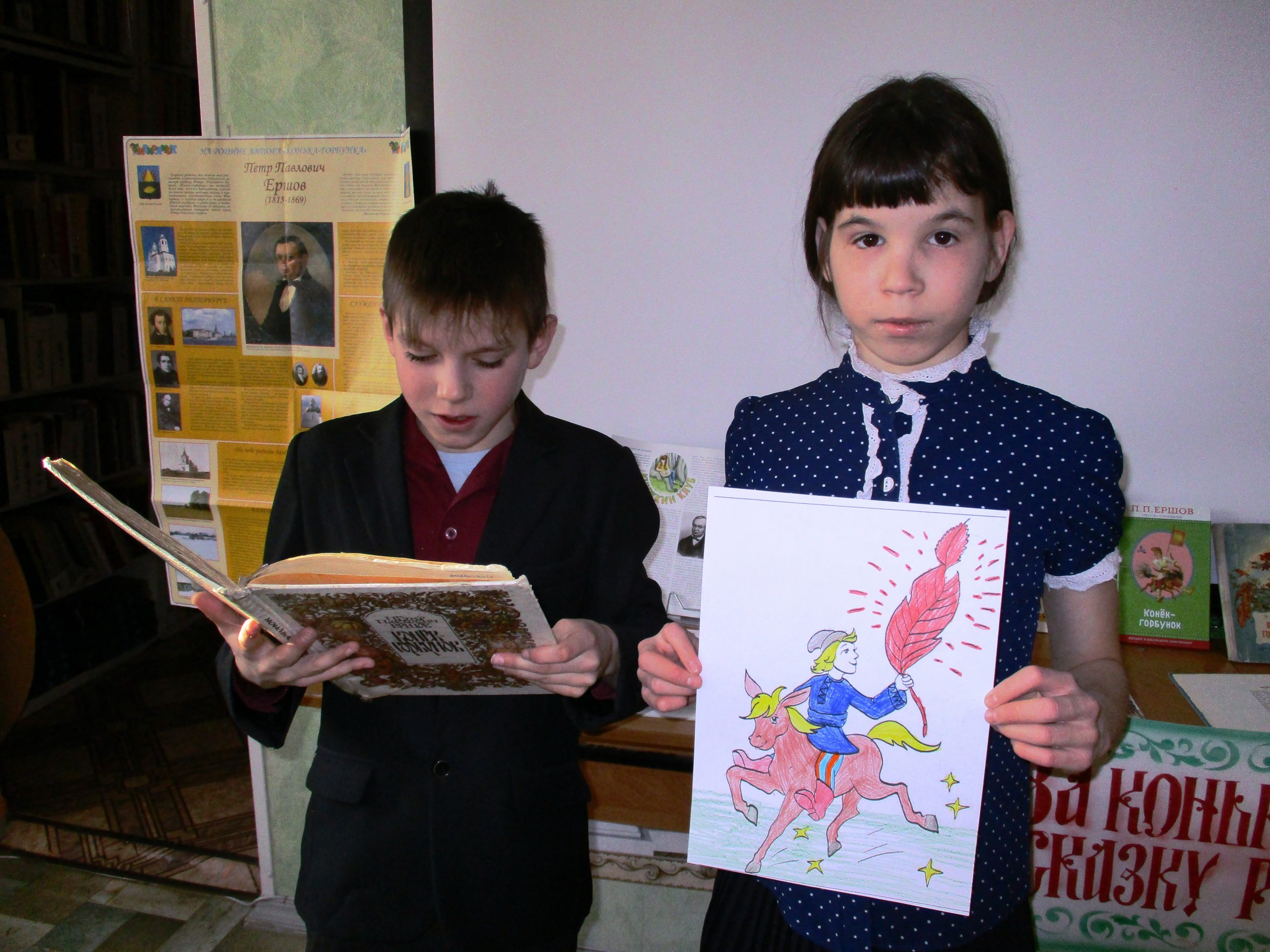 Вторая часть мероприятия была посвящена самой известной книге Ершова «Конек-Горбунок». Ребята отвечали на вопросы викторины, читали вслух отрывки из книги, смотрели отрывок из одноименного мультфильма и раскрашивали картинки с героями сказки. Большой интерес вызвал конкурс «переводчиков», в котором ребята XXI века давали объяснения старинным словам из сказки XIX века — пенять, балясы, почивальня, челядь и другие.
